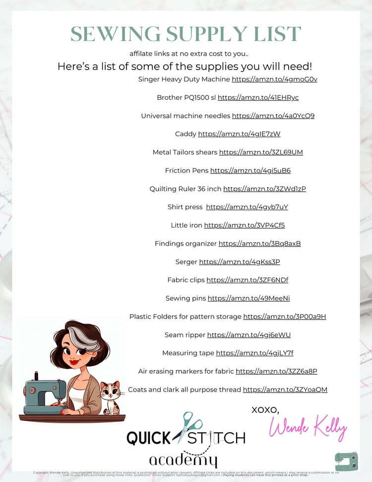 Hi! I'm Wende! A sewing enthusiast with over 40 years of experience, I've stitched my way through just about everything—Victorian costumes, kids' clothes, knitting project bags, and all the creative projects in between. Living the dream on a small farm in coastal Texas, I combine my love of sewing with a passion for teaching. I designs beginner-friendly sewing patterns and run Quick Stitch Academy, a course tailored for people with ADHD or short attention spans. Whether you're looking for fast, fun projects or just a little sewing inspiration, I'm here to show you how quick and gratifying sewing can be!